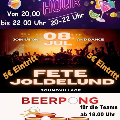 Fete Joldelund mit Soundvillage. Ab 19:00 Uhr Beerpong Turnier, Zuschauer und Fans sind herzlich willkommen. 20-22 Uhr Happy Hour.